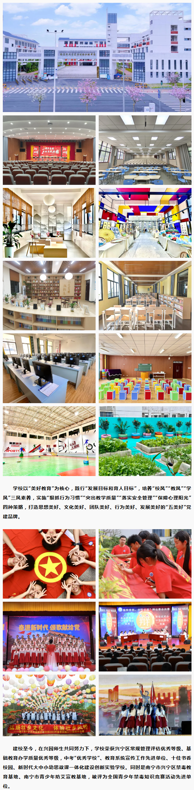 南寧市興寧區(qū)興園路初級(jí)中學(xué)2020年9月落成,于2021年9月獨(dú)立建制,是南寧市興寧區(qū)黨委、政府重點(diǎn)打造的一所現(xiàn)代化公辦初級(jí)中學(xué),是興寧區(qū)教育領(lǐng)域中一個(gè)備受矚目、冉冉升起的教育明星!學(xué)校占地95畝,總建筑面積28241平方米,建設(shè)規(guī)模60個(gè)教學(xué)班,現(xiàn)在崗教職工200多人。教育教學(xué)設(shè)施齊全精良:室內(nèi)體育館、標(biāo)準(zhǔn)田徑場(chǎng)、大型活動(dòng)報(bào)告廳、多媒體教室、賽課室、錄課室、校園電臺(tái)、各學(xué)科功能室和實(shí)驗(yàn)室等。