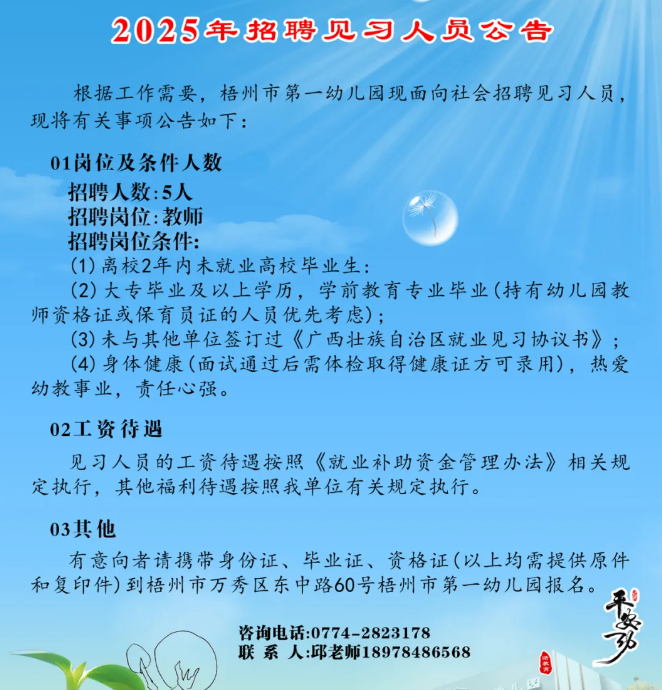 原文標題:梧州市第一幼兒園2025年招聘見習人員公告