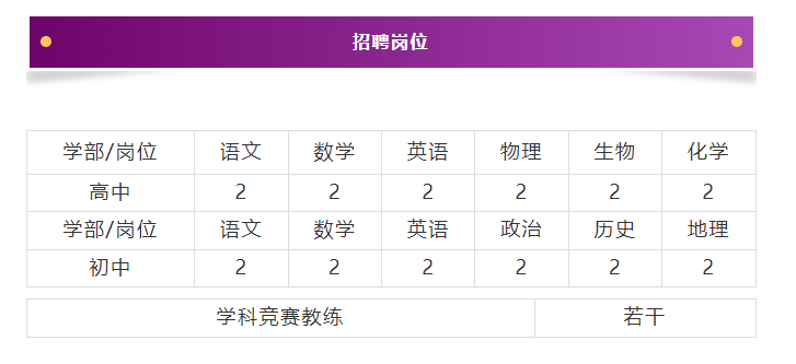 1.薪酬優(yōu)厚:青年教師8-10萬(wàn),骨干教師14-20萬(wàn),學(xué)科帶頭人20-30萬(wàn),學(xué)科競(jìng)賽教練、教齡豐富且成績(jī)優(yōu)秀者面議。