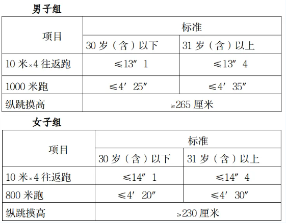2.體測項(xiàng)目和標(biāo)準(zhǔn)。參照《關(guān)于印發(fā)公安機(jī)關(guān)錄用人民警察體能測評項(xiàng)目和標(biāo)準(zhǔn)(暫行)的通知》(人社部發(fā)〔2011〕48號)的項(xiàng)目及測試規(guī)則,結(jié)合《公安民警體育鍛煉達(dá)標(biāo)手冊》成績標(biāo)準(zhǔn),本次體能測評的項(xiàng)目和標(biāo)準(zhǔn)如下: