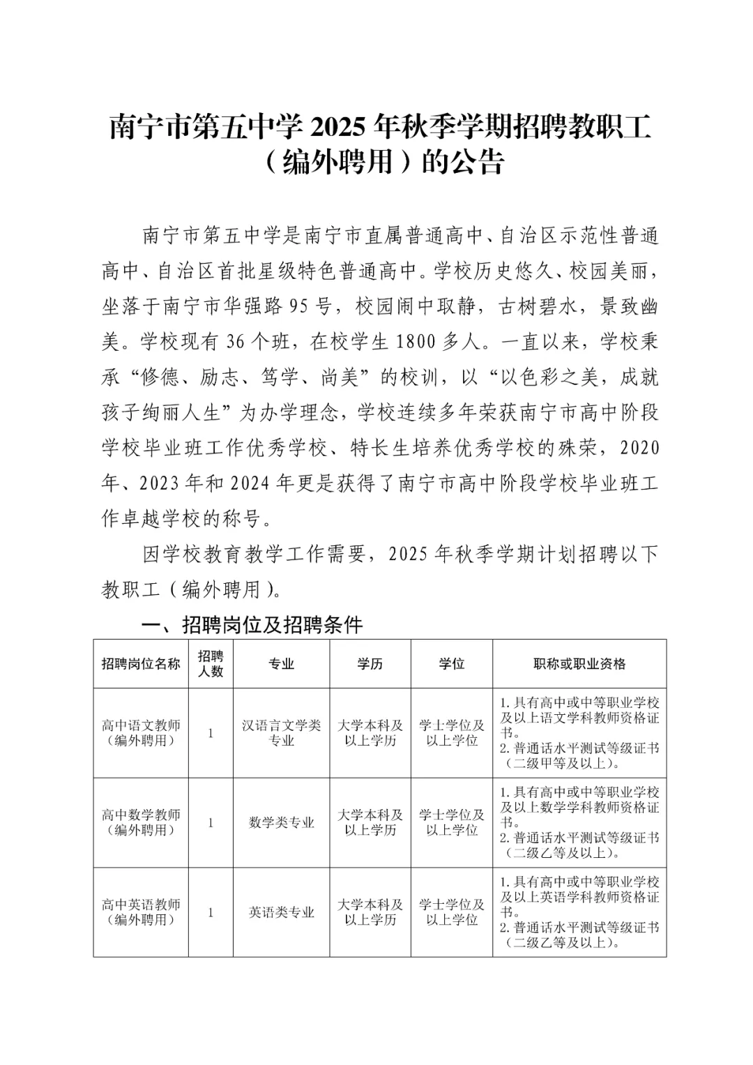 原文標題:南寧市第五中學2025年秋季學期招聘教職工(編外聘用)的公告