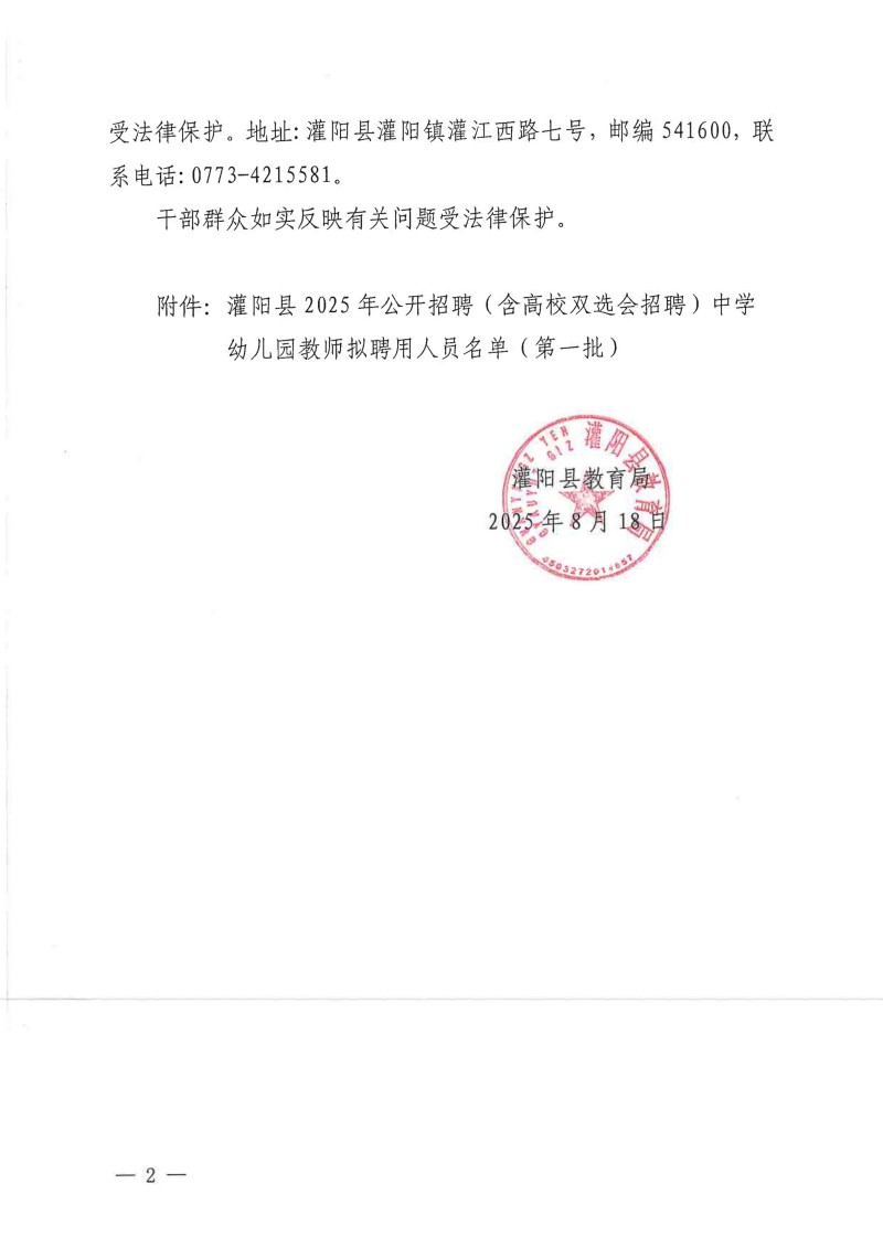 灌陽縣2025年公開招聘(含高校雙選會招聘)中學幼兒園教師擬聘用人員名單(第一批)公示