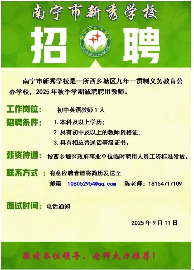 2025年南寧新秀學校招教師1人
