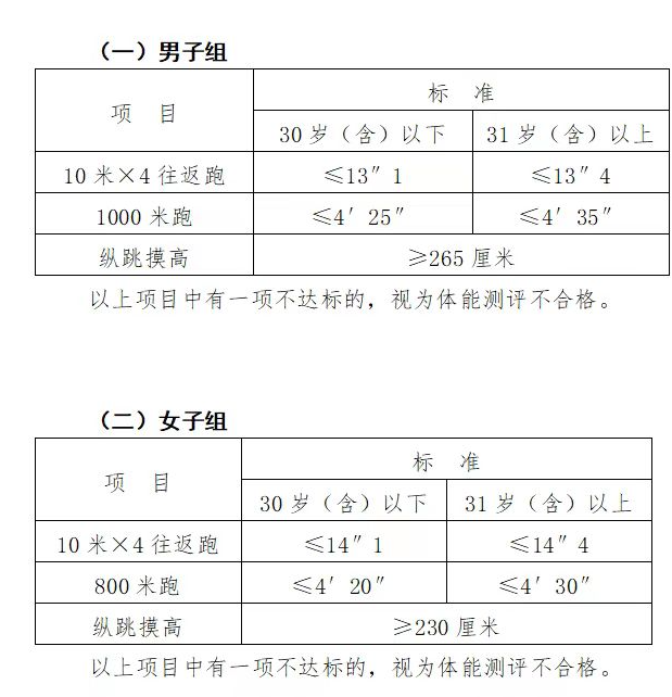 體測項目為縱跳摸高、10米×4往返跑和1000米(男)或800米(女)長跑,體能測試項目評分標(biāo)準(zhǔn)依據(jù)《公安機(jī)關(guān)錄用人民警察體能測評項目和標(biāo)準(zhǔn)(暫行)》執(zhí)行(見附件3),體能測試項目規(guī)則按照《公安機(jī)關(guān)錄用人民警察體能測評實(shí)施規(guī)則》執(zhí)行(見附件4)。